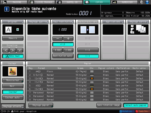 Après l'écran de [Démarrage], l'écran spécifié dans [Ecran par défaut] s'affiche. Appuyez sur l'onglet [COPIER] pour afficher l'écran [COPIER]. Vérifiez que le message [Disponible tâche suivante] est affiché.