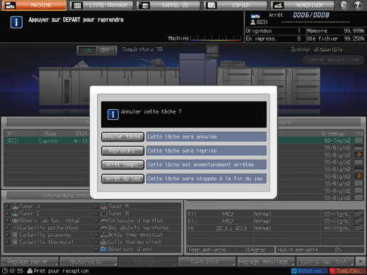 Pour poursuivre les tâches, actionnez l'interrupteur secondaire afin d'afficher l'écran [MACHINE] et appuyez sur la bouton Départ du panneau de contrôle.