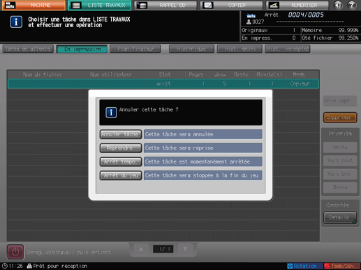 Affichez l'écran [MACHINE], puis appuyez sur Arrêt sur le panneau de contrôle.