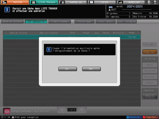 Pour annuler la poursuite de la tâche le lendemain, appuyez sur [Non]. L'écran [LISTE TRAVAUX] réapparaît.