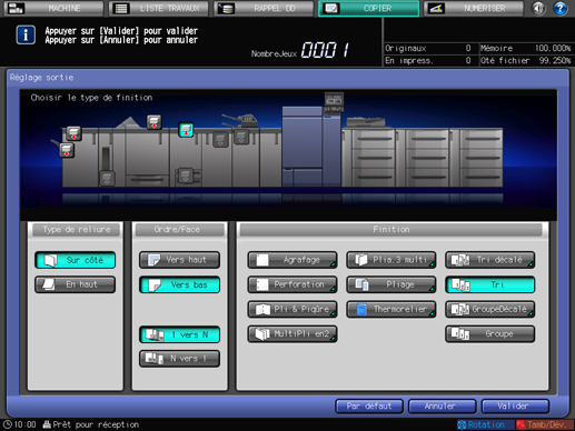 Sans la sélection de [2->2] ou [2->1] à l'étape 3, le message [Le type de reliure est actif uniquement lors de numéris.réglage r-v d'original] s'affiche et le réglage [En haut] est inopérante.