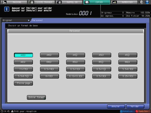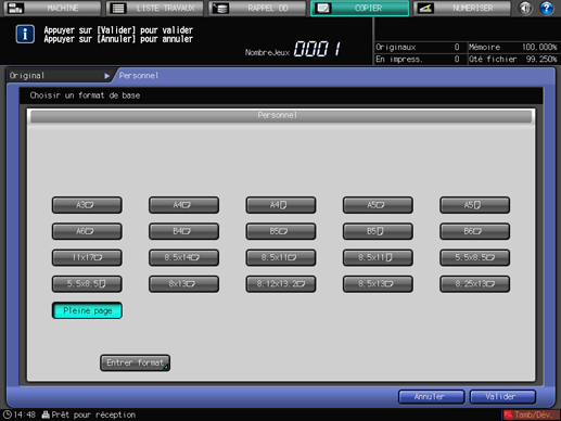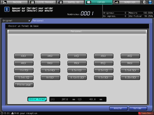Appuyez sur [Valider]. Le format spécifié s'affiche sur l'écran [Personnel] . Pour revenir à l'écran [COPIER], appuyez sur [Terminé].