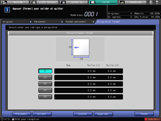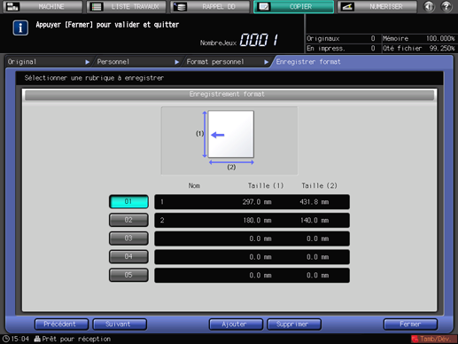 Vous pouvez enregistrer des formats personnalisés. Les informations de formats enregistrés peuvent être utilisés ultérieurement dans les réglages de format papier original et copie.