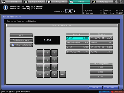 Les réglages Agrandissement/Réduction (fixe) et Taux programmés s'effectuent sur l'écran [UTILITAIRE]. Pour en savoir plus, voir Taux de restitution : enregistrement de l'agrandissement.