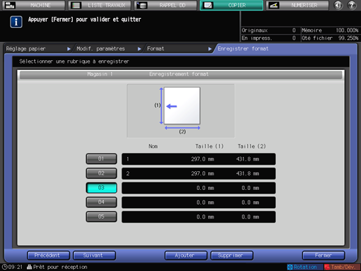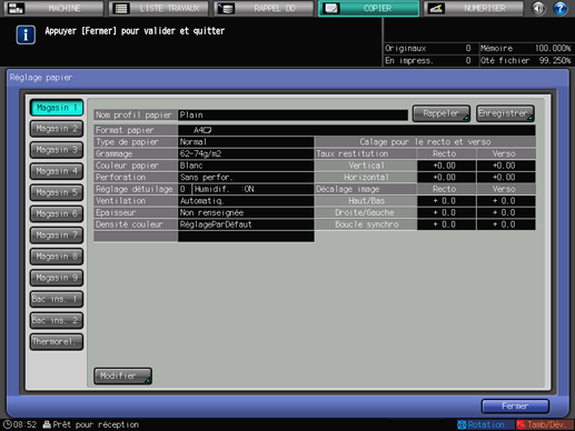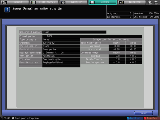 Lorsque le réglage papier est finalisé, appuyez sur [Fermer]. L'écran [MACHINE] ou [COPIER] réapparaît.