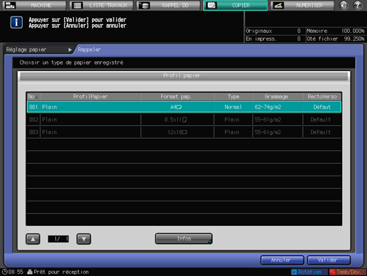 Si une entrée est sélectionnée avec un [ProfilPapier] affiché, les conditions papier enregistrées sont remplacées par les nouveaux réglages.