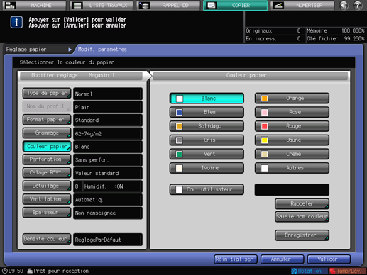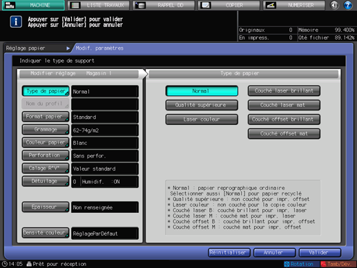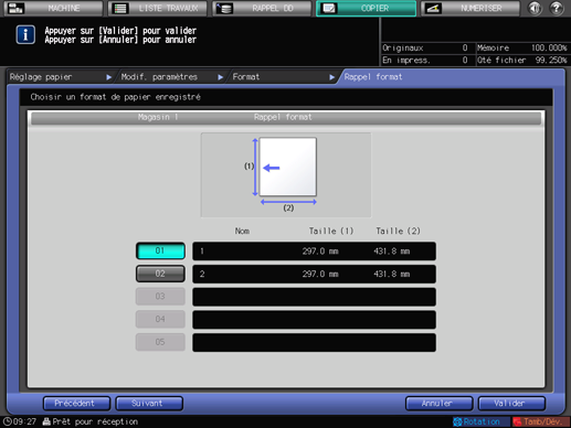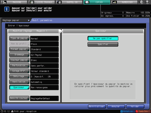 L'écran [Réglage papier] réapparaît. L'écran affiche les conditions papier qui viennent d'être spécifiées.