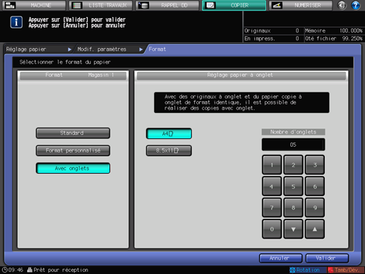La sélection [Avec onglets] affiche l'écran [Réglage papier à onglet].