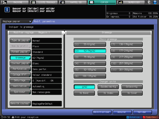 L'écran [Grammage] s'affiche. Sélectionnez une touche de grammage sous [Choix grammage].