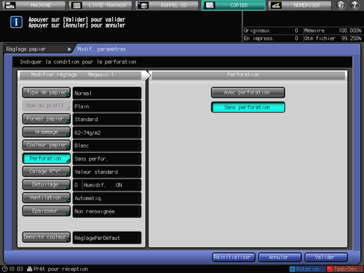 Pour charger des feuilles perforées, sélectionnez [Avec perforation] et pour charger des feuilles sans perforation, sélectionnez [Sans perforation].