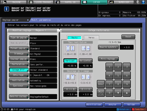 Si vous modifiez les réglages de [Taux restitution] pour [Recto] ou [Verso], [Décalage de l'image], [Boucle synchro] et [Mire réglage], l'indication de [Calage R°V°] de l'écran [Modif. paramètres] devient [Valeur modifiée].