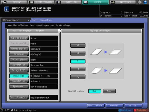 Si le grammage de [Laser couleur] est réglé entre 55 g/m2 et 135 g/m2 / 14 lb Bond et 36 lb Bond et que le grammage de [Couché laser B], [Couché laser M], [Couché offset B] et [Couché offset M] est réglé entre 81 g/m2 et 135 g/m2 / 22 lb Bond et 36 lb Bond, la sélection [Humidificateur] n'est plus accessible et [Oui]/[Non] sont estompés.