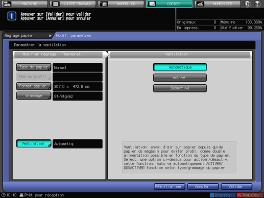 Si vous sélectionnez le magasin [Thermorel.] du thermorelieur PB-503 à l'étape 5 et que vous appuyez sur [Ventilation], l'écran [Ventilation] suivant s'affiche.