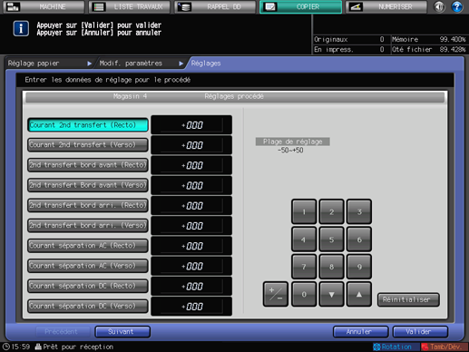 Parmi les éléments [Courant 2nd transfert (Recto)] à [Bord arr.effacer qté] affichés en appuyant sur [Suivant], sélectionnez le bouton de l'élément que vous souhaiter régler. Entrez les valeurs à l'aide du clavier de l'écran tactile, [