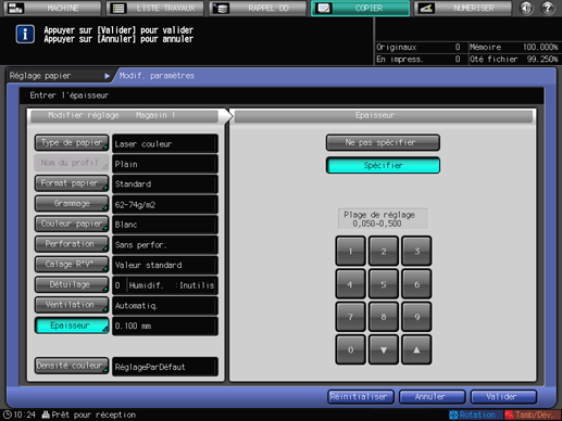 La valeur entrée est affichée à droite de [Epaisseur] dans la partie gauche de l'écran. Lorsque vous entrez une valeur inférieure à 0,050 mm, elle est automatiquement réglée sur 0,050 mm.