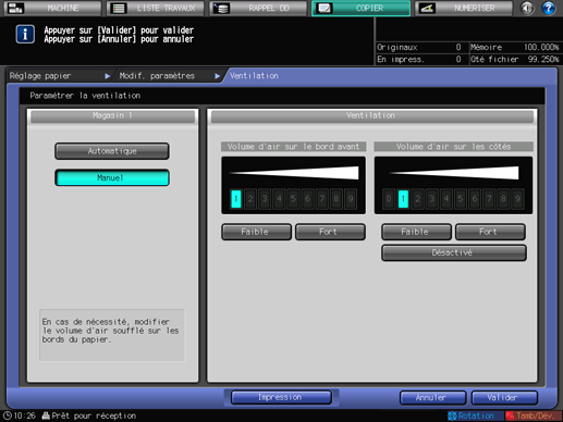 Si vous sélectionnez le [Magasin 1] ou le [Magasin 9] de l'unité d'alimentation papier PF-707 ou de l'unité d'alimentation papier PF-708 à l'étape 5 et appuyez ensuite sur [Ventilation], l'écran [Ventilation] suivant s'affiche.