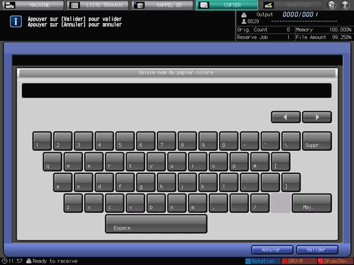 Pour changer le nom de couleur spécifié, appuyez sur [Saisie nom couleur] pour afficher l'écran [Saisie nom du papier coloré] et renommez-la.