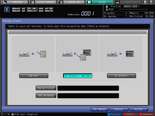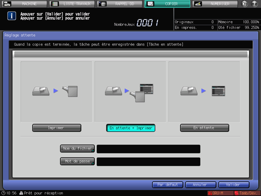 Lorsque vous sélectionnez [En attente + Imprimer] ou [En attente], les champs [Nom du fichier] et [Mot de passe] sont accessibles à la saisie.