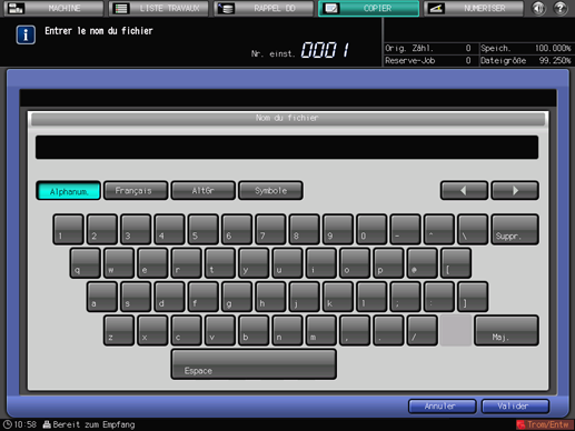 L'entrée d'un [Nom du fichier] n'est pas impérative. Dans ce cas, la machine assigne automatiquement les quatre derniers chiffres de l'ID tâche à créer.