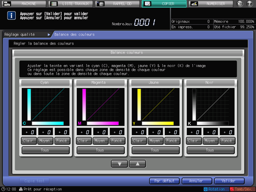 Pour afficher l'écran [Balance couleurs], appuyez sur le bouton [Bal. couleurs] et effectuez le réglage souhaité pour chaque couleur [Cyan], [Magenta], [Jaune] et [Noir].