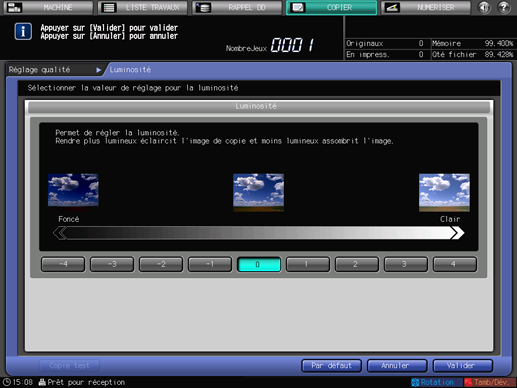 L'écran [COPIER] réapparaît. L'indication [Luminosité] se trouve sous l'onglet [Réglage qualité] de l'écran [COPIER].