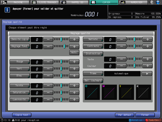 L'écran [COPIER] réapparaît. L'indication [Bal. couleurs] se trouve sous l'onglet [Réglage qualité] de l'écran [COPIER].