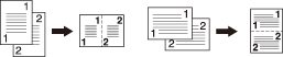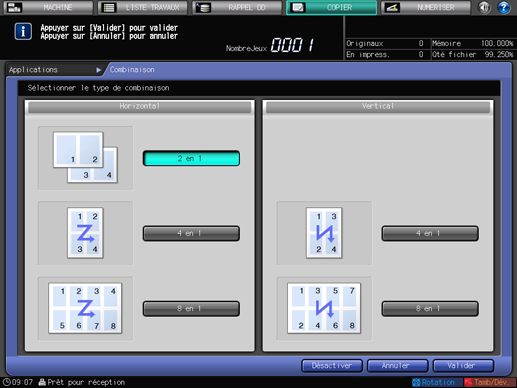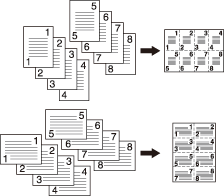 Utilisez cette fonction pour disposer et copier un nombre fixe (2, 4 ou 8) de pages sur une même feuille de papier de façon à réduire la consommation de papier. Les options suivantes sont proposées dans [Combinaison]. La position de départ de combinaison dépend de la configuration de [Direction].