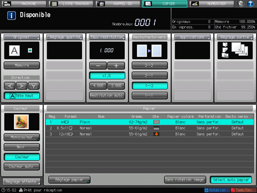 Affichez l'écran [COPIER] et appuyez sur le bouton qui convient sous [Recto/recto-vers.].