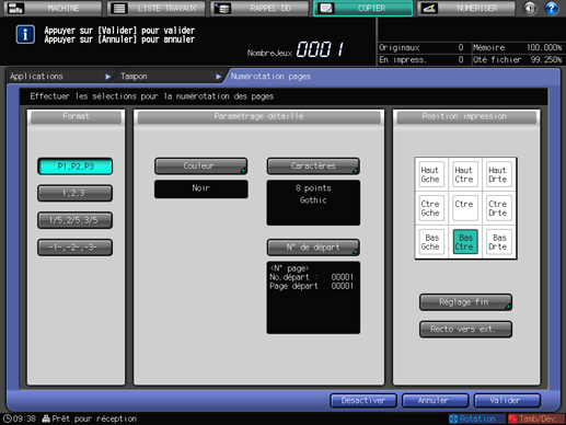 Définissez les paramètres [Format], [Paramétrage détaillé] ([Couleur], [Caractères], [N° de départ]) et [Position impression] du mode Numérotation de page.