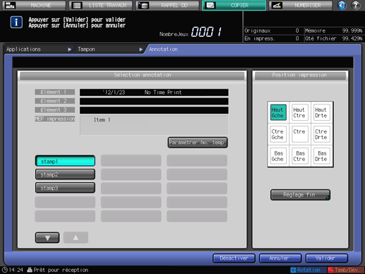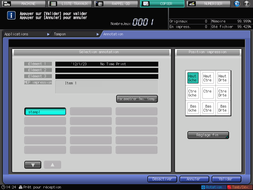 Cette fonction vous permet de rappeler une combinaison de texte, date/heure de chargement de l'original et numéro d'annotation de l'original et de les imprimer sur les copies imprimées à l'endroit désigné. Vous pouvez modifier temporairement le numéro d'annotation sur l'écran Annotation après le rappel du réglage prédéfini ([Paramétrer No. temp]).