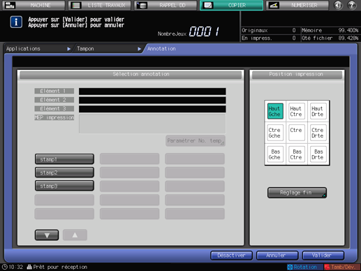 Sélectionnez une des neuf positions d'impression disponibles sous [Position impression]. Pour effectuer un réglage fin, appuyez sur [Réglage fin].