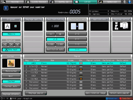 Un maximum de 4 raccourcis de réglages de sortie fréquemment utilisés peuvent être affichés sous l'onglet [Réglage sortie] de l'écran [COPIER]. Ces touches permettent de définir la fonction sortie en un clic ou de passer directement à l'écran de réglage correspondant. Vous pouvez effectuer le réglage des touches de raccourci dans le [Réglage utilisateur] du menu Utilitaires.