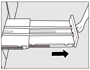 Les jeux pliés et agrafés (et massicotés) sont éjectés dans le bac de réception de la piqueuse à cheval. Si le bac n'est pas entièrement tiré, la machine détecte que le bac est plein, même si le nombre de jeux de finition est inférieur au nombre spécifié.