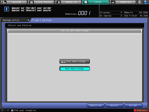 Spécifiez s'il faut utiliser la fonction de massicotage en sélectionnant [Avec massicotage] ou [Sans massicotage].