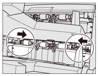 Trois rouleaux d'alimentation sont fixés à chacun des magasins, supérieur et inférieur, et entraînent les feuilles. Le verrouillage des rouleaux latéraux pour utiliser uniquement le rouleau médian peut éviter aux petites couvertures de s'engager de travers.