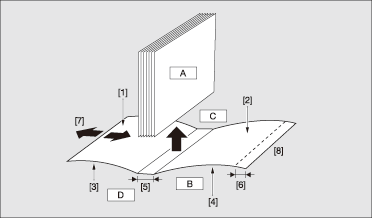 A : Corps de document B : Couverture C : Tête D : Pied | [1] Verso de la face couverture [2] Verso du dos couverture [3] Recto de la face couverture [4] Recto du dos couverture [5] Largeur dos [6] Massicot Couverture [7] Réglage bord avant couverture [8] Reliure à gauche (haut en bas pour reliure à droite) |