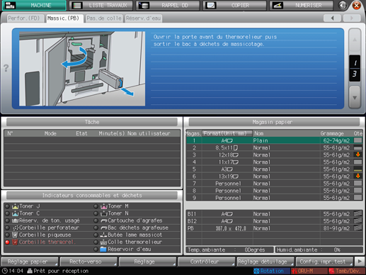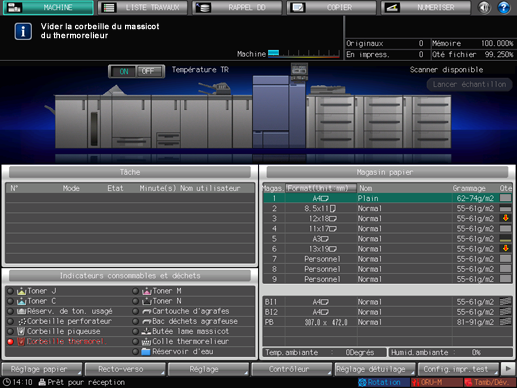 Appuyez sur l'indicateur [Corbeille thermorel.] dans la zone Indicateurs consommables et déchets de l'écran [MACHINE].