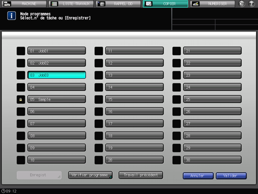 Affichez l'écran [COPIER] avant de sélectionner la touche Programmes du panneau de contrôle pour afficher l'écran [Mode programmes]. L'écran [Mode programmes] ne s'affiche pas si un autre programme comme l'écran [MACHINE] est affiché.