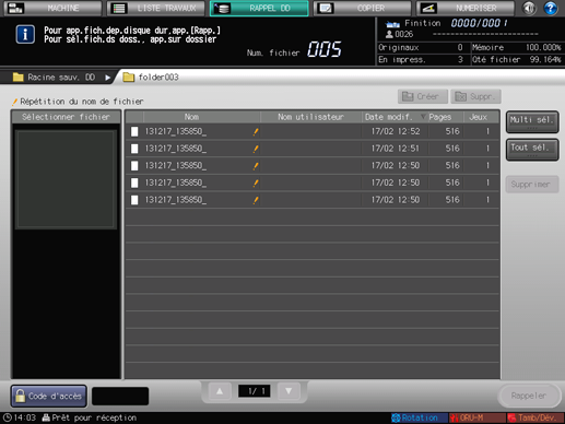Pour rappeler une tâche enregistrée dans un autre dossier de l'écran [Racine sauv. DD], appuyez sur ce dossier. Le contenu du dossier sélectionné sera listé à l'écran.