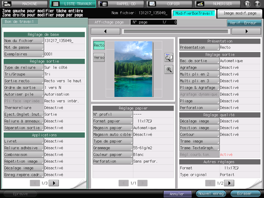 Appuyez sur [BonTravail] pour afficher l'écran [ModifierBonTravail] ou appuyez sur [Mod.page] pour afficher l'écran [Image modif.page].