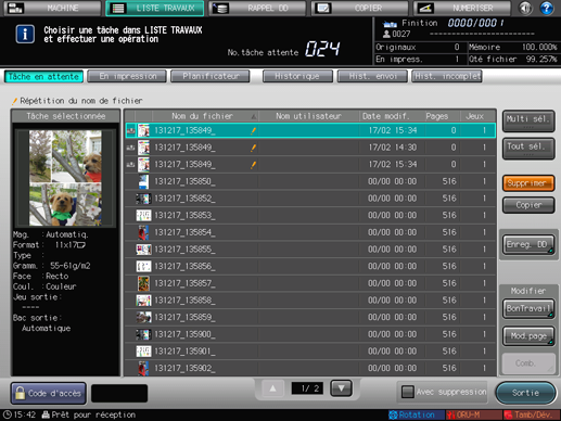 Appuyez sur l'onglet [LISTE TRAVAUX] pour afficher l'écran [LISTE TRAVAUX].