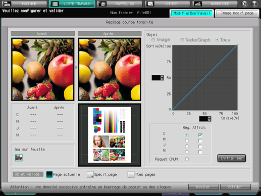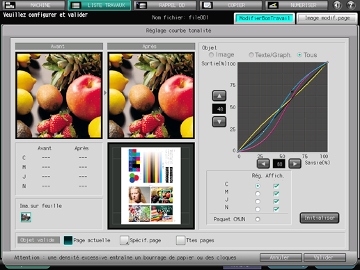 Vous pouvez régler la luminosité et le contraste de chaque couleur en modifiant la courbe de tonalité de chacune des couleurs CMJN ou la courbe de tonalité du paquet CMJN dans les données image de la tâche en attente. Vous pouvez aussi régler la courbe de tonalité de chaque onglet (image ou texte/graphiques).