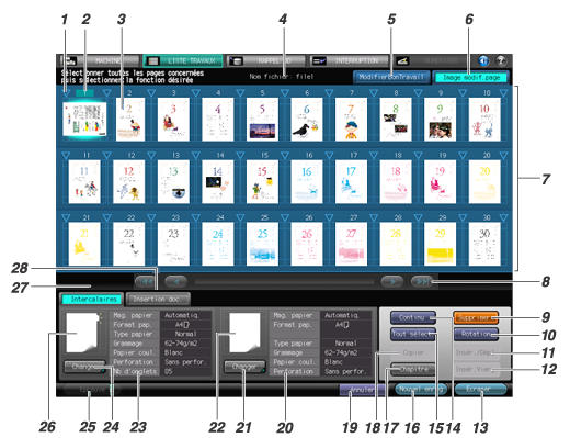 26 | Icône Avec onglet | Sélectionnez pour définir la destination du papier à onglet. Sélectionnez l'icône du papier à onglets pour la mettre en surbrillance, sélectionnez le point d'insertion, puis appuyez sur [Insér./Dépl.] pour insérer le papier à onglets à l'endroit spécifié. |