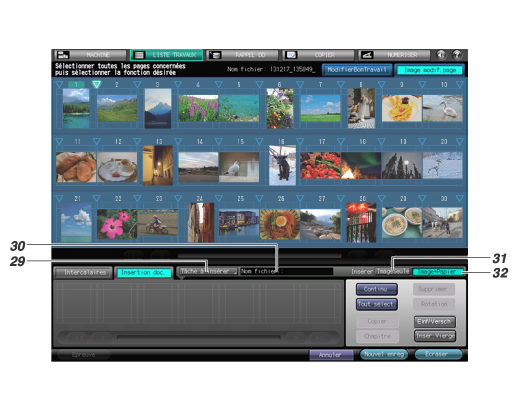 30 | Affichage du nom de fichier | Affiche le nom du fichier image du travail retenu sélectionné pour les insertions. |