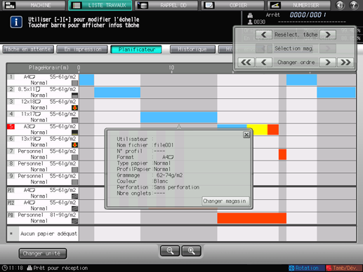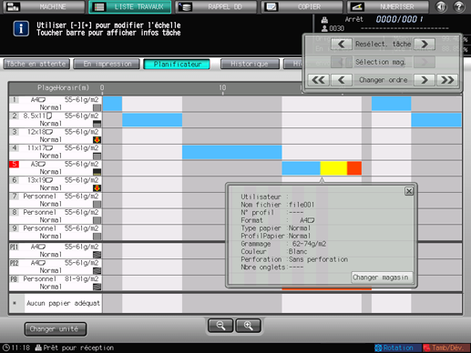 Vous ne pouvez pas quitter l'écran [Planificateur] si le dialogue opération ou réglage papier est affiché. Pour quitter l'écran [Planificateur], appuyez sur [x] dans le coin supérieur droit du dialogue afin de le refermer.