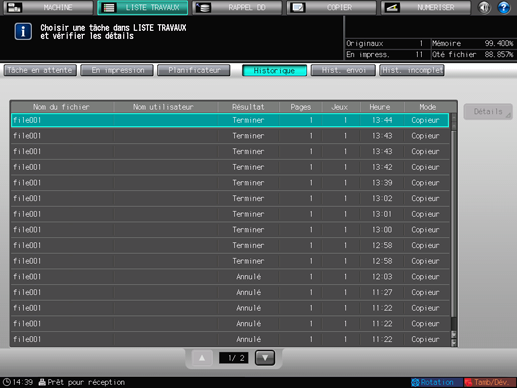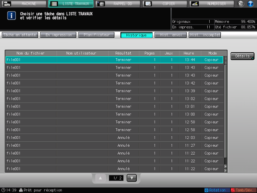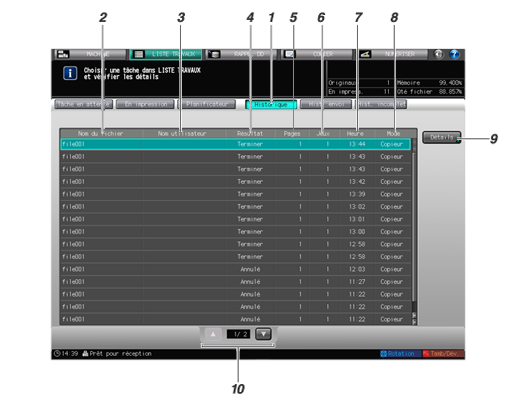 Appuyez sur l'onglet [LISTE TRAVAUX] de l'écran, puis appuyez sur [Historique].