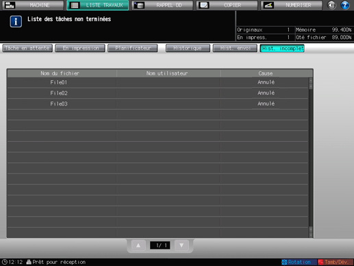 Appuyez sur l'onglet [LISTE TRAVAUX] de l'écran, puis appuyez sur [Hist. incomplet].