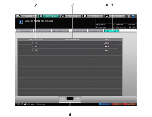 5 | Touches de défilement | Permet de faire défiler la liste de l'historique incomplet. Le numéro de page actuelle et le nombre total de pages de la liste sont affichés entre les touches. |