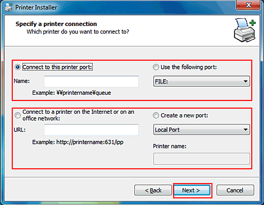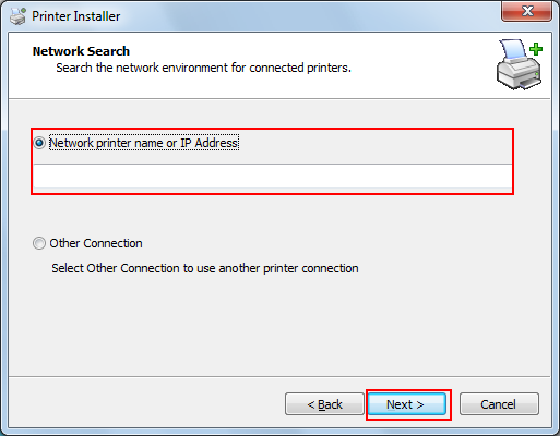 Entrez le nom d'imprimante ou l'adresse IP et cliquez sur [Suivant].
