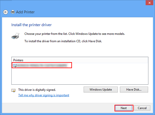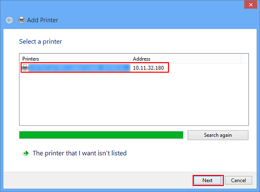 Sous Windows Vista/Server 8/Server 2012 , vous pouvez installer le pilote d'imprimante en recherchant l'imprimante sur le réseau ou en créant un nouveau port d'imprimante.